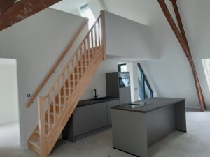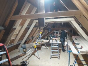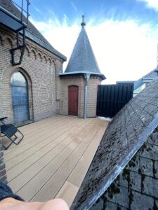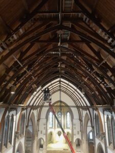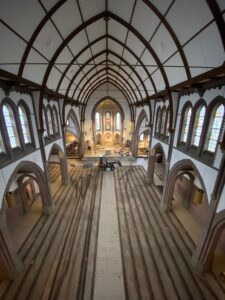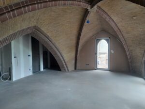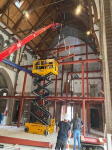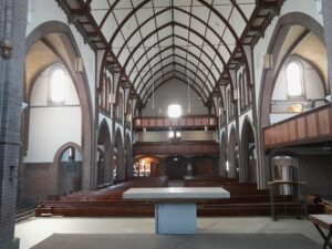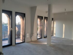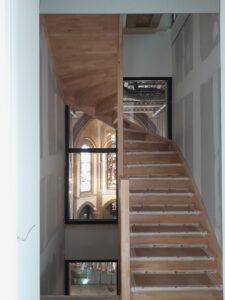 Wij hebben er 4 verdiepingen in gemaakt met een volledig inpandig staal constructie zodat de buiten kant van de kerk zo veel mogelijk intact bleef, Daar op hebben we staalplaat vloeren gelegd en volgestort met beton waar door ze 3 verdiepingen met betonvloer hebben, En daar nog een houten vloer als 4e verdieping zodat de bovenste appartementen 2 verdiepingen hebben. Omdat alles te kunnen dragen hebben ze er 39 boorpalen in gedraaid tot 6 meter diep.Met op de 1e,2e,3e verdiepingen 14 appartementen met een bijzondere uitstraling met togen en gewelven waar nog veel van in tact en in het zicht zijn gebleven, Met ieder een eigen balkon met op de bovenste verdieping inpandige balkons. Glas in lood vervangen door nieuw geisoleerde kunststof kozijnen geplaatst in voorzet wanden waardoor alle togen bewaard konden blijven en toch een mooie licht in val kreeg. op de begane grond is nog een studio, dokterspraktijk, rouwcentrum en nog een zaal voor 80 personen met podium gevestigd. dit alles werd door een kleine opening gedaan (zie foto3) om de buiten kant van de kerk zijn uitstraling te houden, en voor die opening is daarna een uitbouw gemaakt