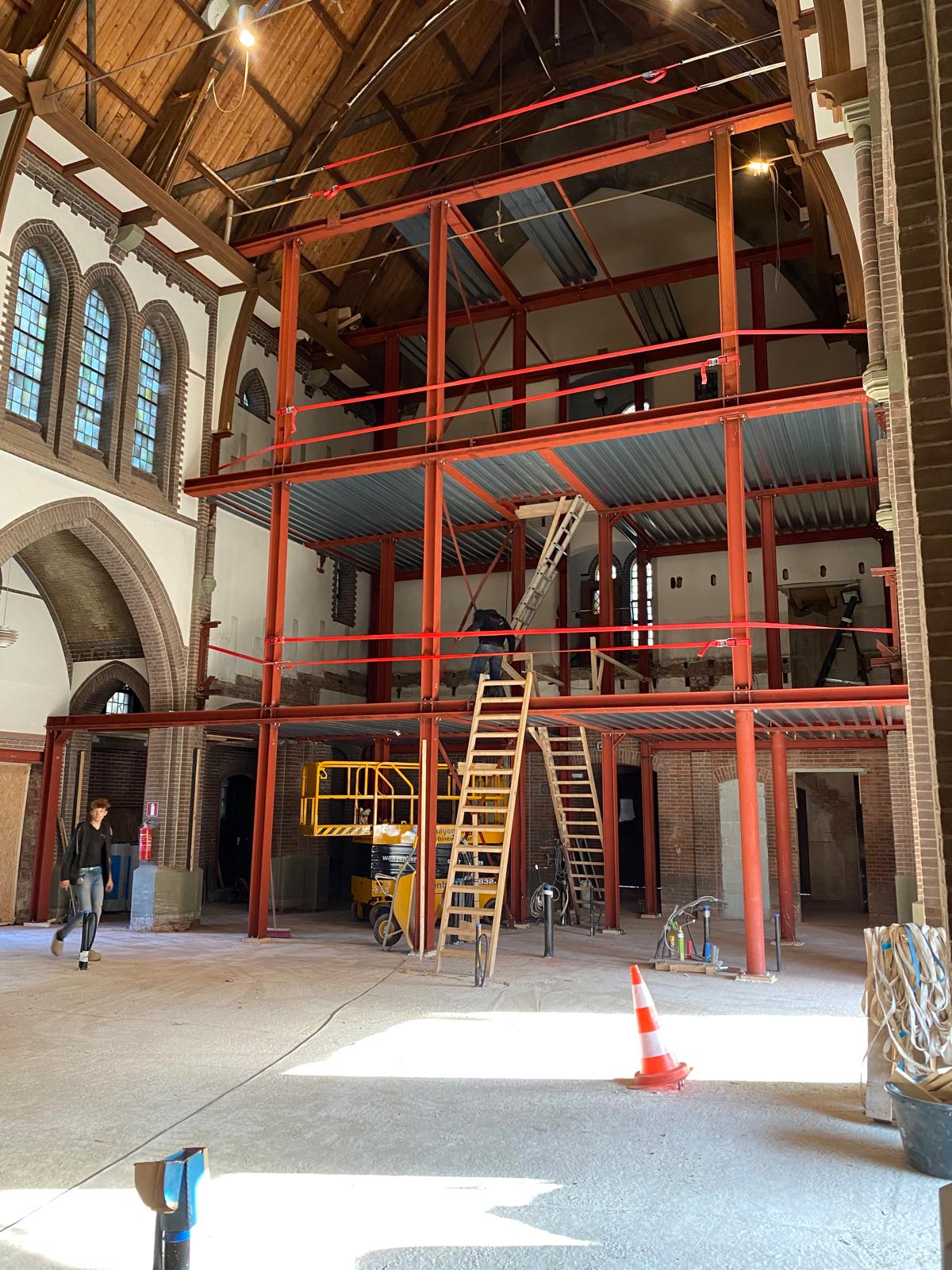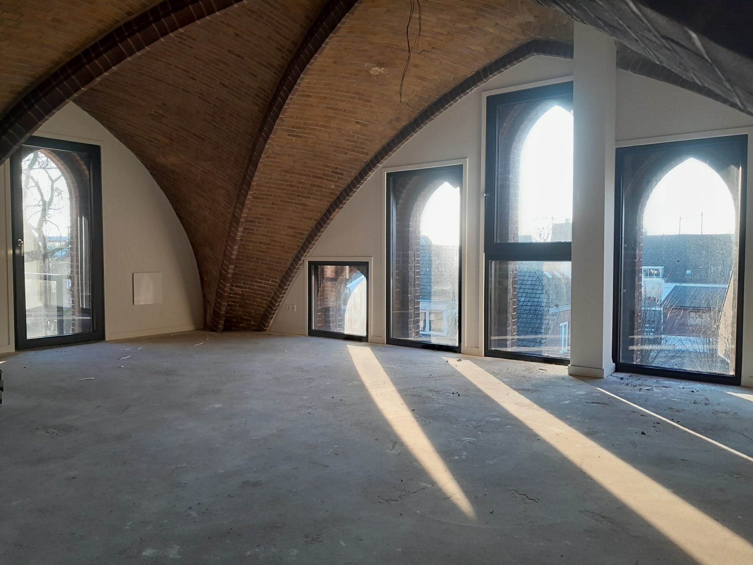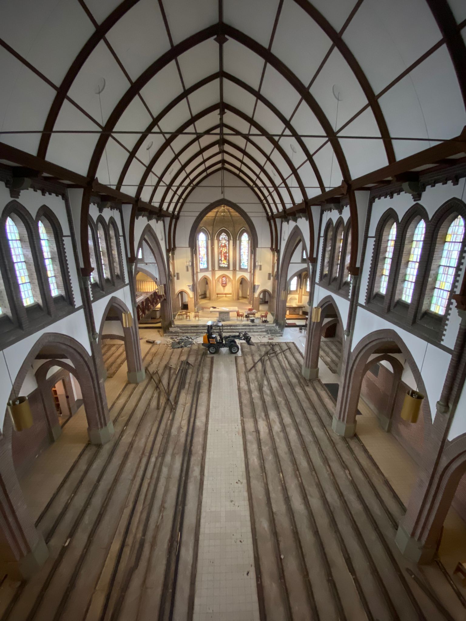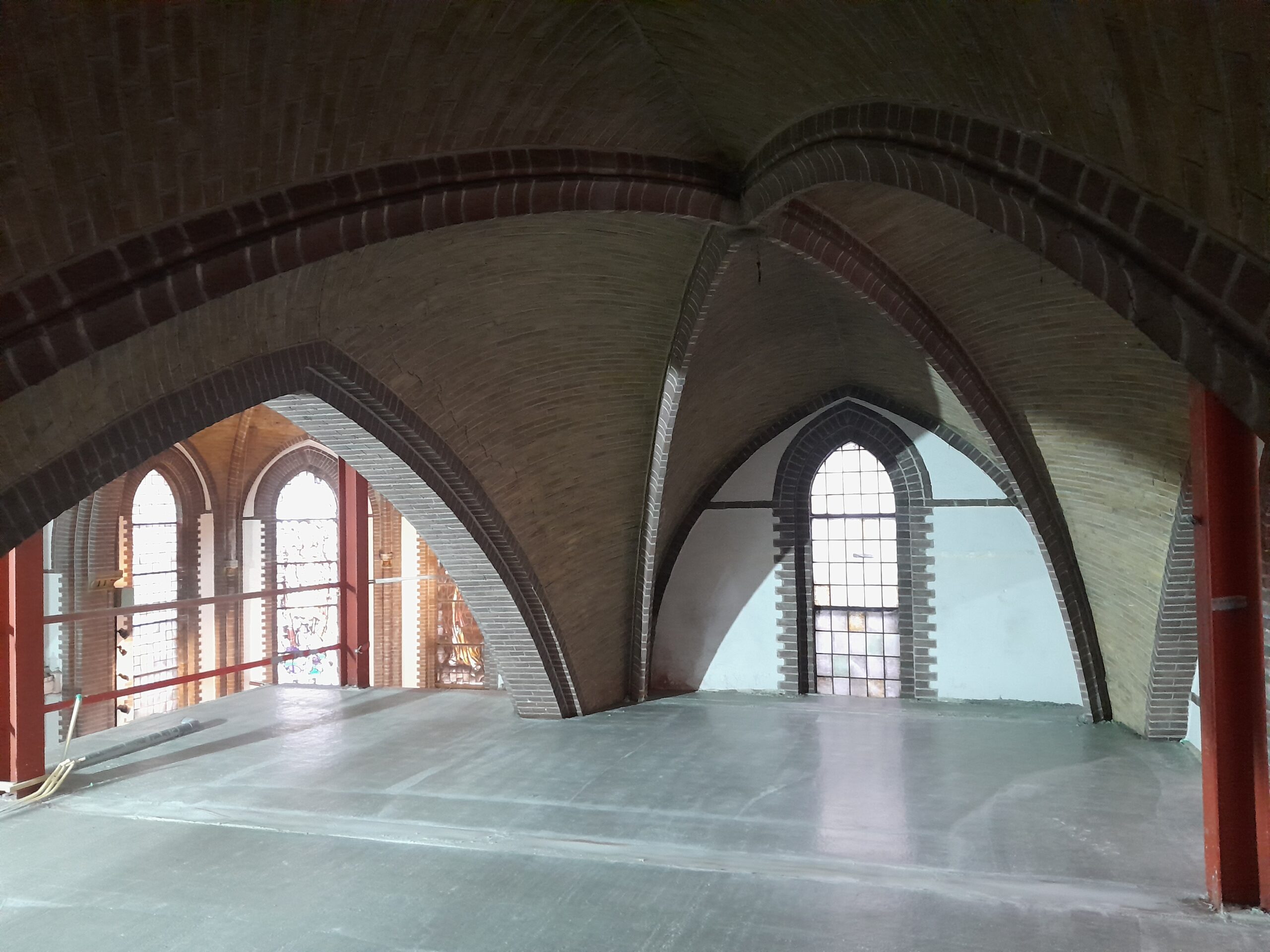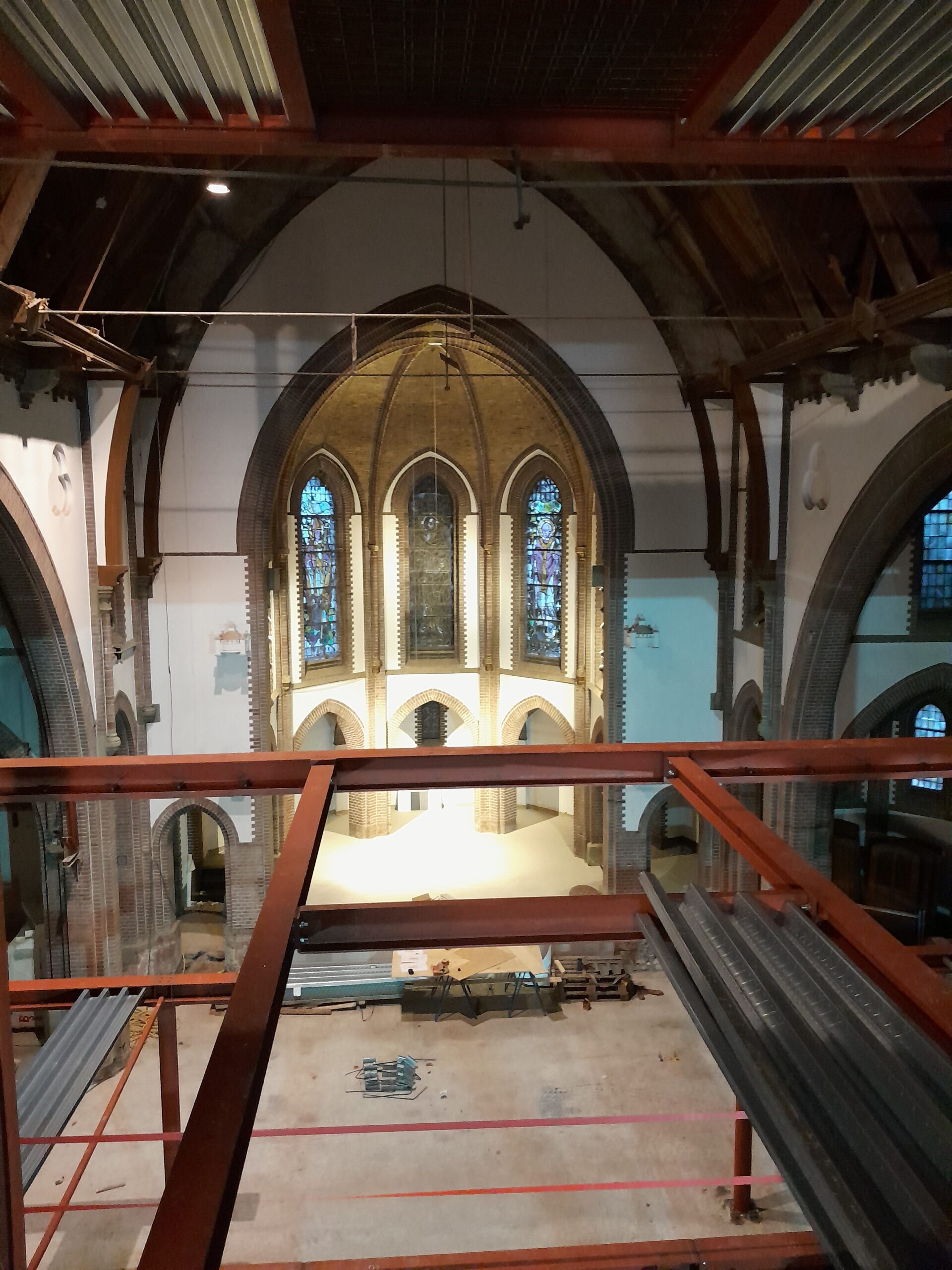 Wij hebben er 4 verdiepingen in gemaakt met een volledig inpandig staal constructie zodat de buiten kant van de kerk zo veel mogelijk intact bleef, Daar op hebben we staalplaat vloeren gelegd en volgestort met beton waar door ze 3 verdiepingen met betonvloer hebben, En daar nog een houten vloer als 4e verdieping zodat de bovenste appartementen 2 verdiepingen hebben. Omdat alles te kunnen dragen hebben ze er 39 boorpalen in gedraaid tot 6 meter diep.Met op de 1e,2e,3e verdiepingen 14 appartementen met een bijzondere uitstraling met togen en gewelven waar nog veel van in tact en in het zicht zijn gebleven, Met ieder een eigen balkon met op de bovenste verdieping inpandige balkons. Glas in lood vervangen door nieuw geisoleerde kunststof kozijnen geplaatst in voorzet wanden waardoor alle togen bewaard konden blijven en toch een mooie licht in val kreeg. op de begane grond is nog een studio, dokterspraktijk, rouwcentrum en nog een zaal voor 80 personen met podium gevestigd. dit alles werd door een kleine opening gedaan (zie foto3) om de buiten kant van de kerk zijn uitstraling te houden, en voor die opening is daarna een uitbouw gemaakt