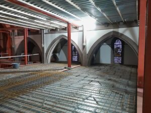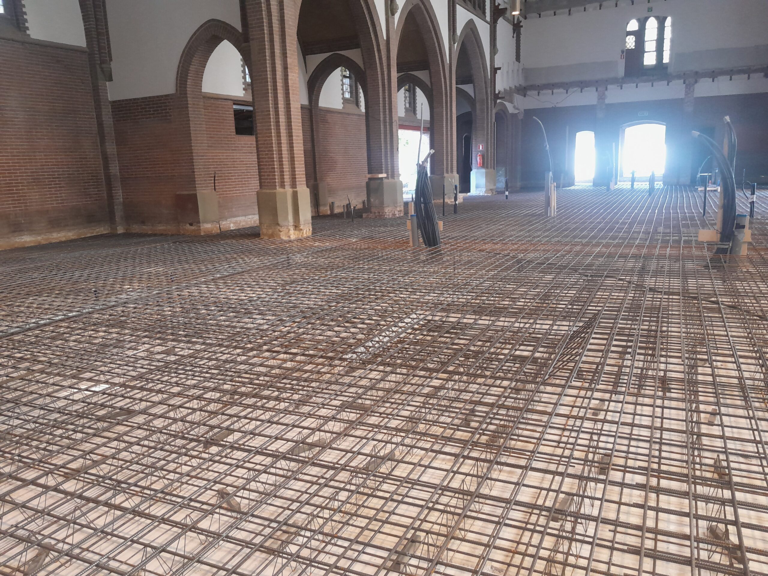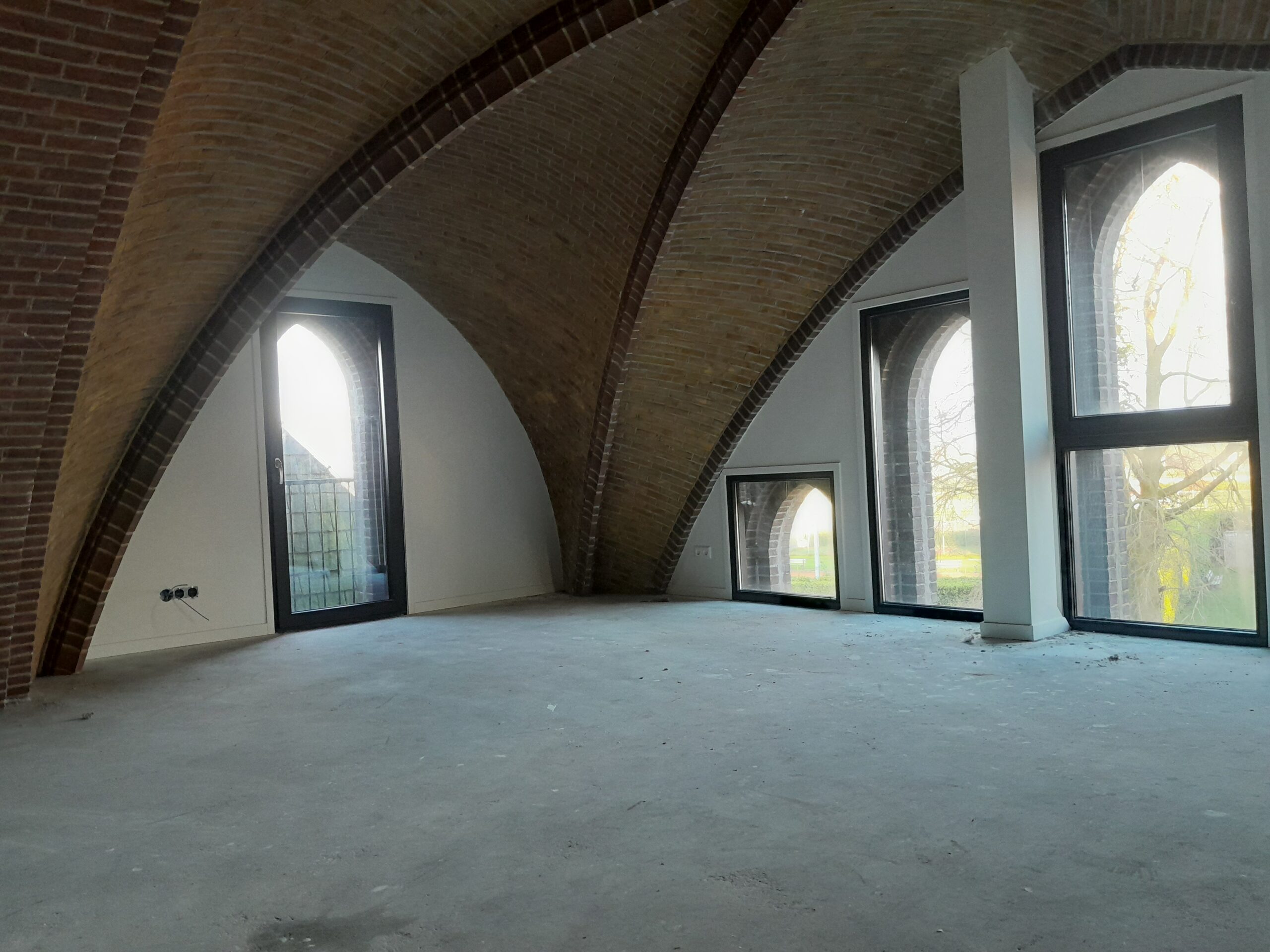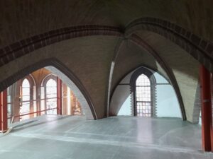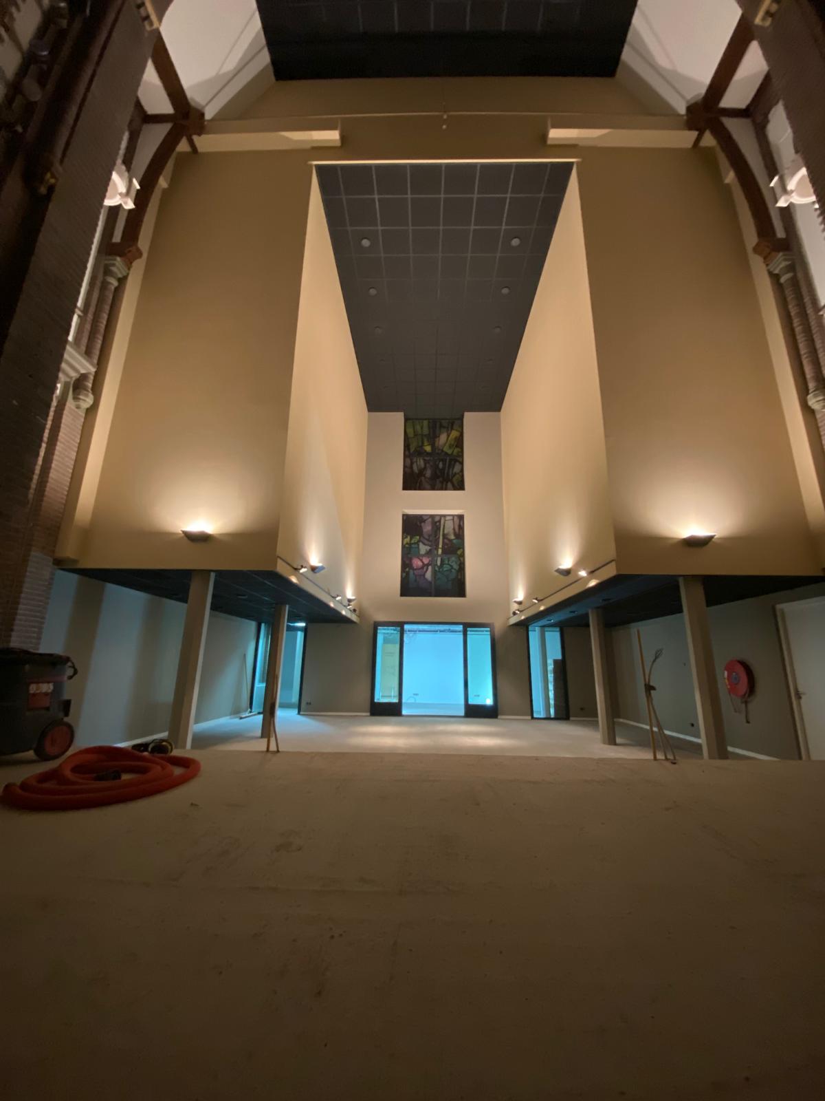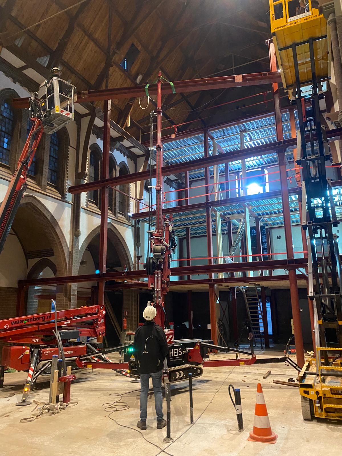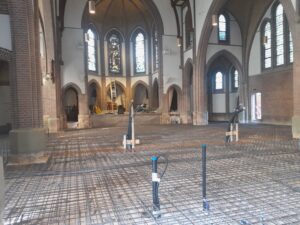 Wij hebben er 4 verdiepingen in gemaakt met een volledig inpandig staal constructie zodat de buiten kant van de kerk zo veel mogelijk intact bleef, Daar op hebben we staalplaat vloeren gelegd en volgestort met beton waar door ze 3 verdiepingen met betonvloer hebben, En daar nog een houten vloer als 4e verdieping zodat de bovenste appartementen 2 verdiepingen hebben. Omdat alles te kunnen dragen hebben ze er 39 boorpalen in gedraaid tot 6 meter diep.Met op de 1e,2e,3e verdiepingen 14 appartementen met een bijzondere uitstraling met togen en gewelven waar nog veel van in tact en in het zicht zijn gebleven, Met ieder een eigen balkon met op de bovenste verdieping inpandige balkons. Glas in lood vervangen door nieuw geisoleerde kunststof kozijnen geplaatst in voorzet wanden waardoor alle togen bewaard konden blijven en toch een mooie licht in val kreeg. op de begane grond is nog een studio, dokterspraktijk, rouwcentrum en nog een zaal voor 80 personen met podium gevestigd. dit alles werd door een kleine opening gedaan (zie foto3) om de buiten kant van de kerk zijn uitstraling te houden, en voor die opening is daarna een uitbouw gemaakt