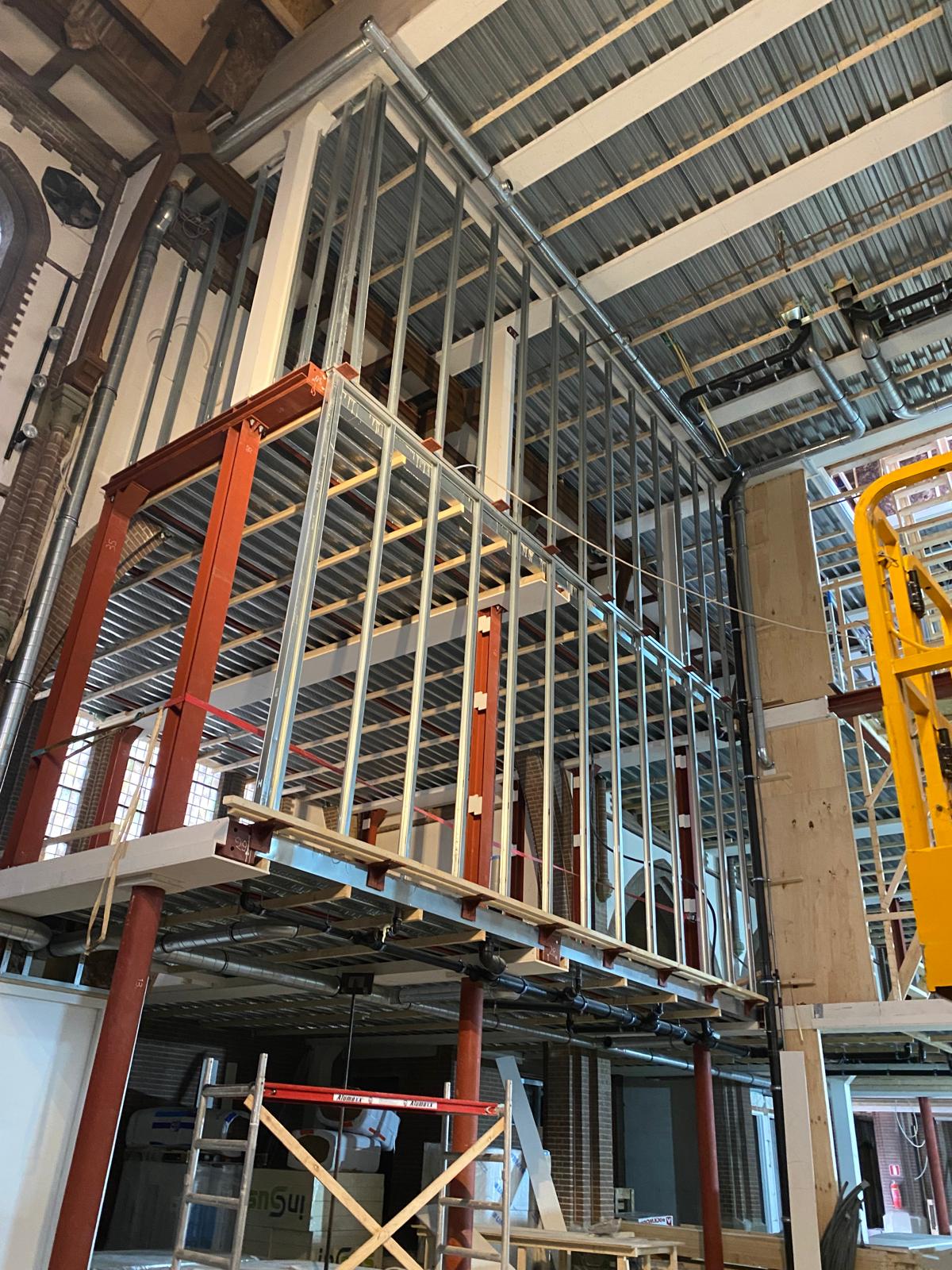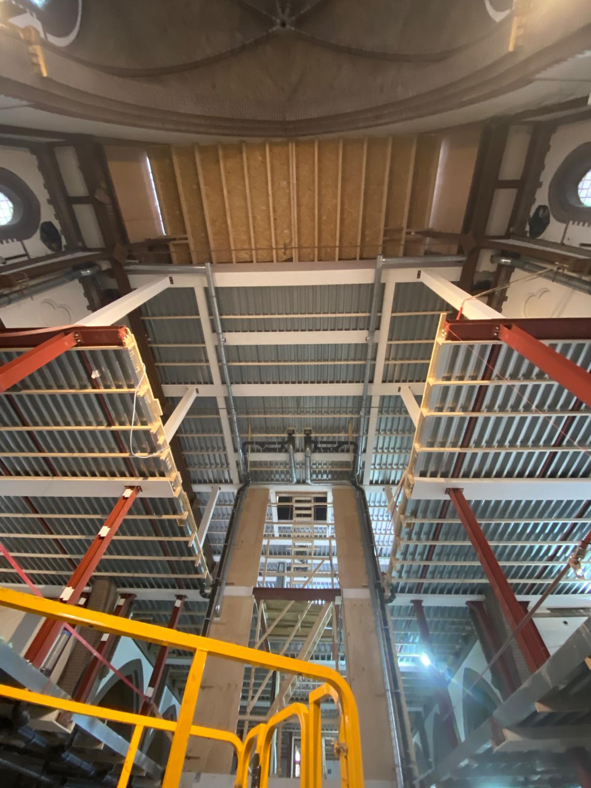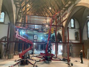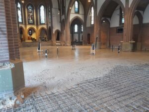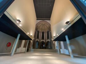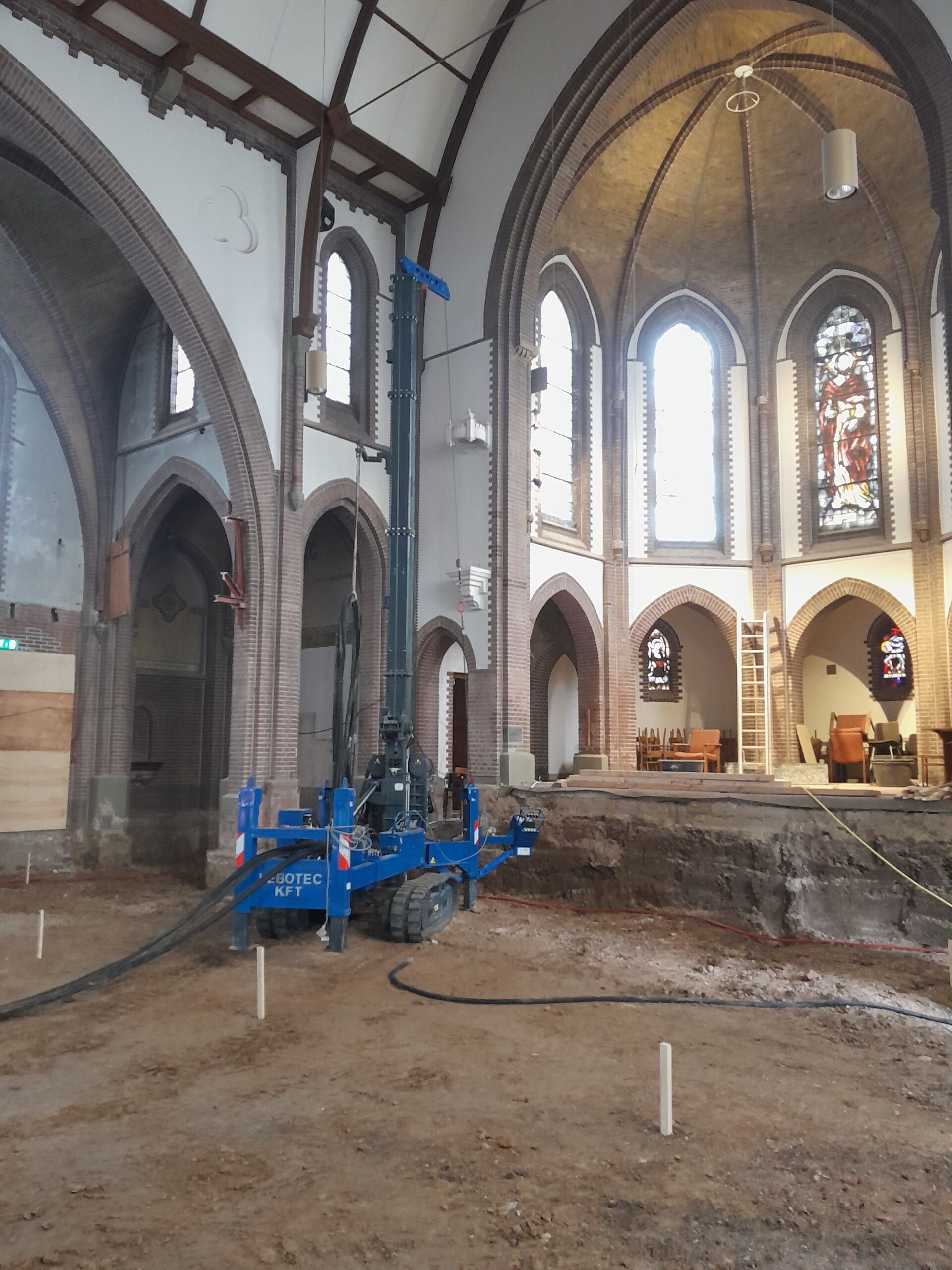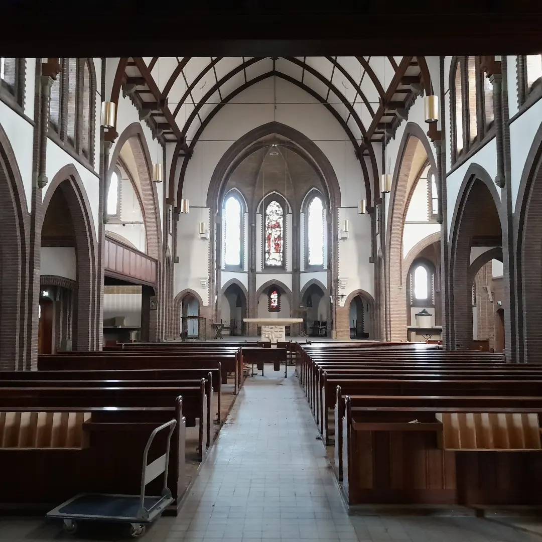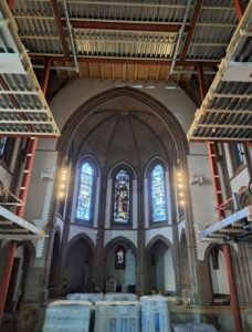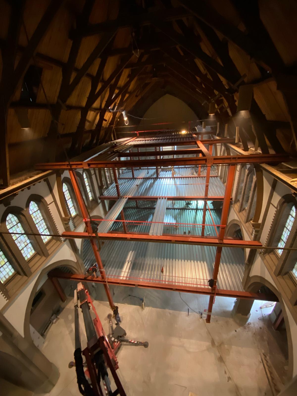 Wij hebben er 4 verdiepingen in gemaakt met een volledig inpandig staal constructie zodat de buiten kant van de kerk zo veel mogelijk intact bleef, Daar op hebben we staalplaat vloeren gelegd en volgestort met beton waar door ze 3 verdiepingen met betonvloer hebben, En daar nog een houten vloer als 4e verdieping zodat de bovenste appartementen 2 verdiepingen hebben. Omdat alles te kunnen dragen hebben ze er 39 boorpalen in gedraaid tot 6 meter diep.Met op de 1e,2e,3e verdiepingen 14 appartementen met een bijzondere uitstraling met togen en gewelven waar nog veel van in tact en in het zicht zijn gebleven, Met ieder een eigen balkon met op de bovenste verdieping inpandige balkons. Glas in lood vervangen door nieuw geisoleerde kunststof kozijnen geplaatst in voorzet wanden waardoor alle togen bewaard konden blijven en toch een mooie licht in val kreeg. op de begane grond is nog een studio, dokterspraktijk, rouwcentrum en nog een zaal voor 80 personen met podium gevestigd. dit alles werd door een kleine opening gedaan (zie foto3) om de buiten kant van de kerk zijn uitstraling te houden, en voor die opening is daarna een uitbouw gemaakt