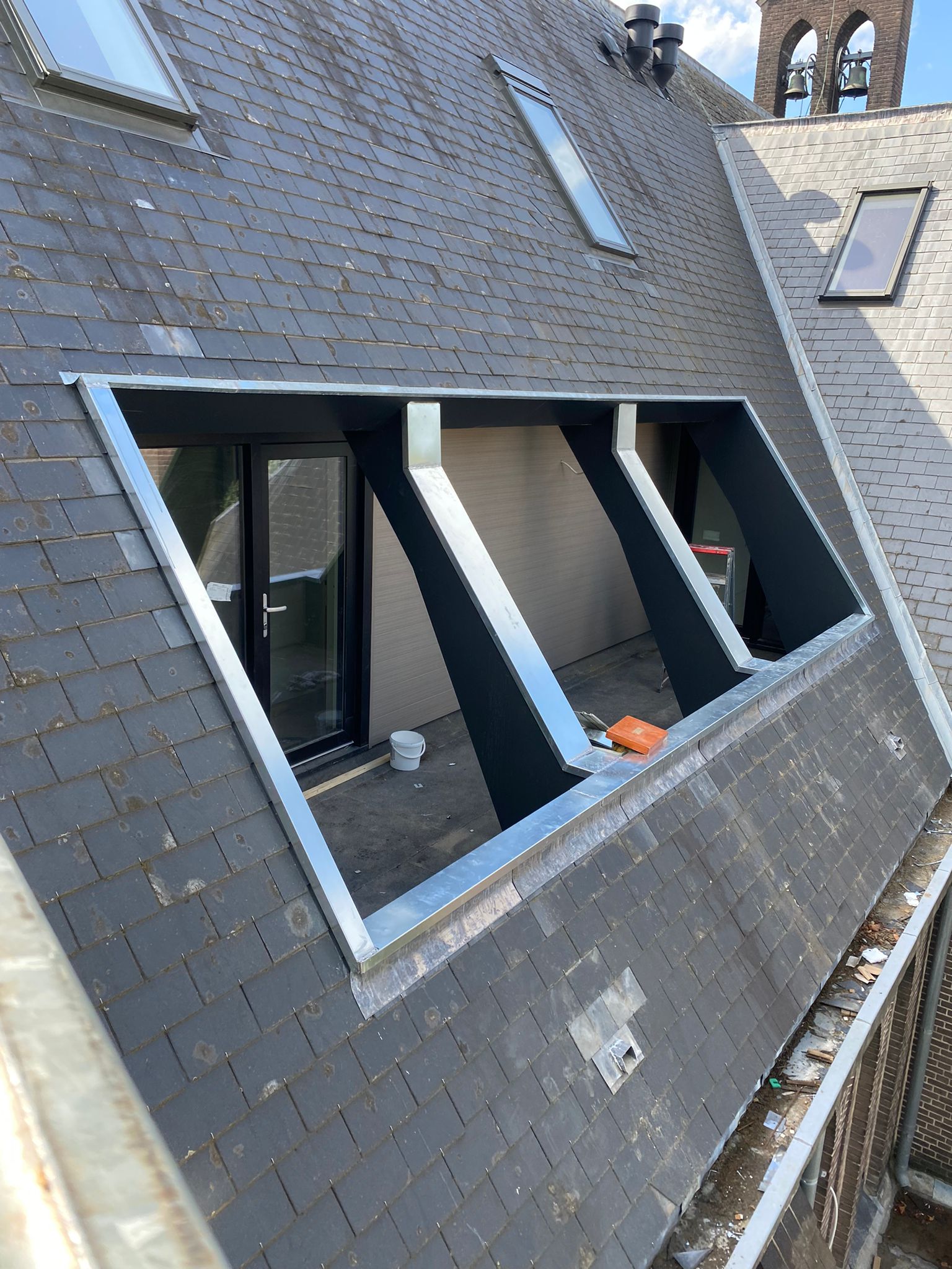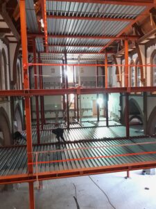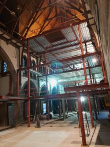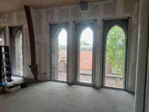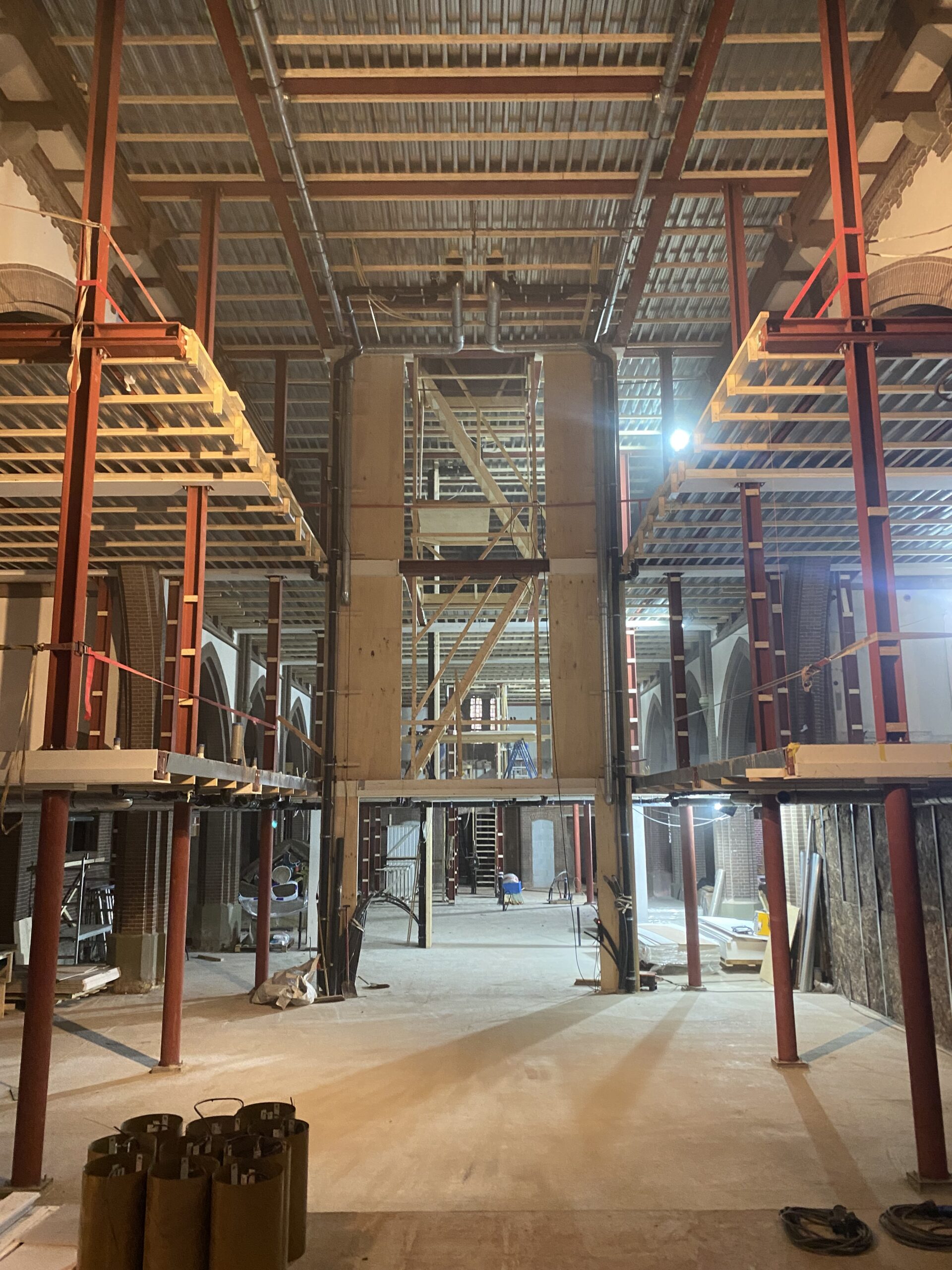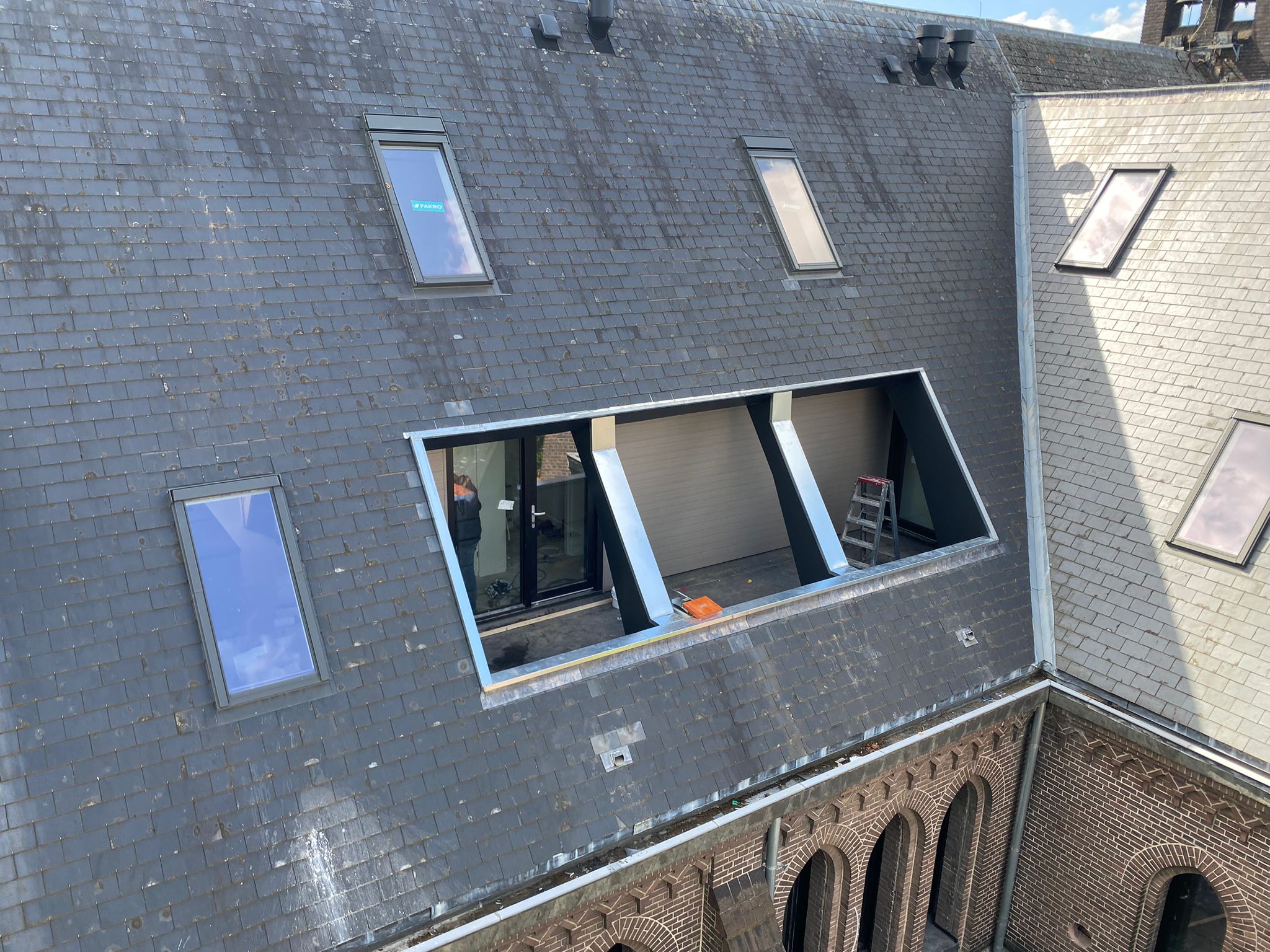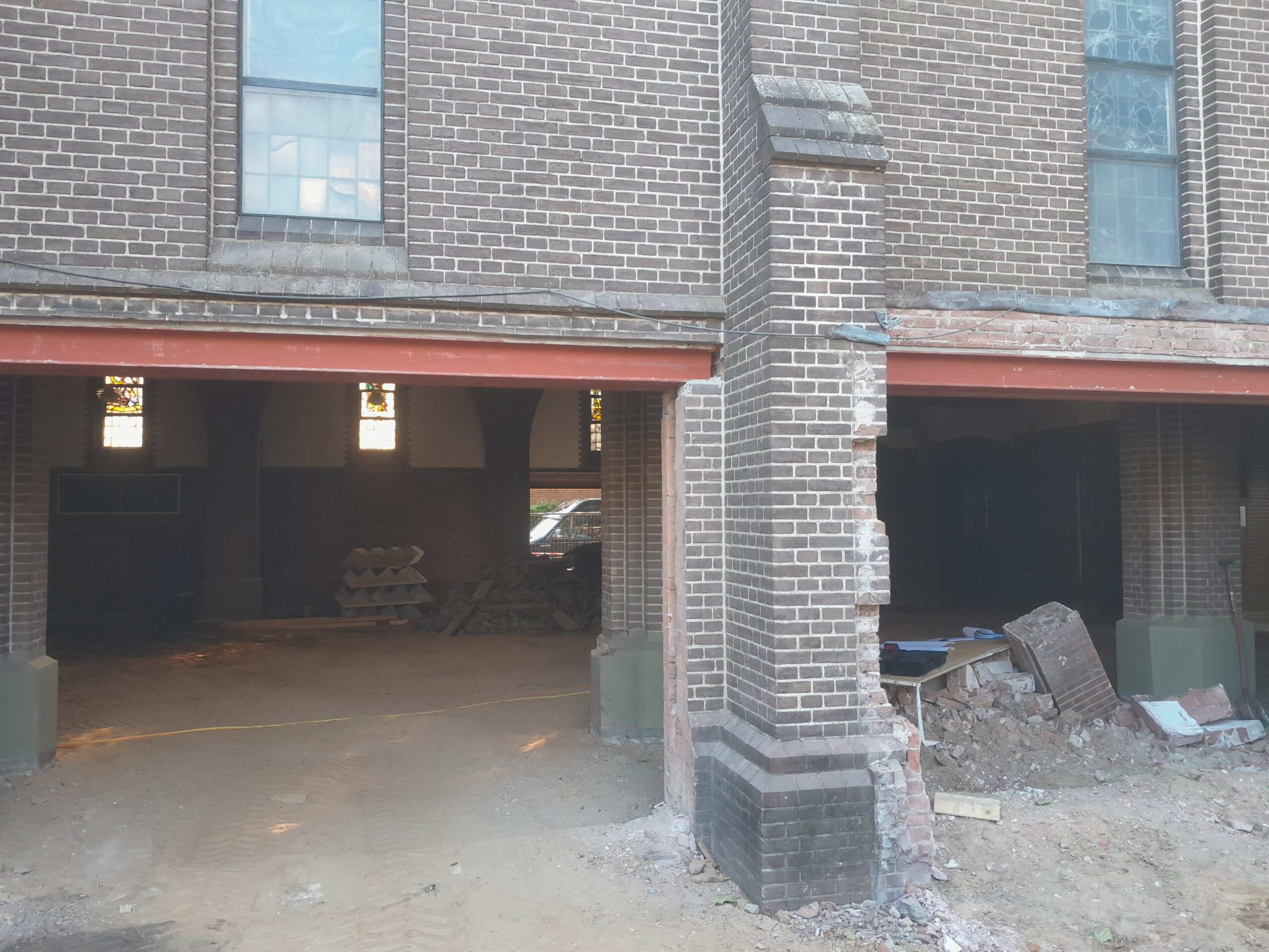 Wij hebben er 4 verdiepingen in gemaakt met een volledig inpandig staal constructie zodat de buiten kant van de kerk zo veel mogelijk intact bleef, Daar op hebben we staalplaat vloeren gelegd en volgestort met beton waar door ze 3 verdiepingen met betonvloer hebben, En daar nog een houten vloer als 4e verdieping zodat de bovenste appartementen 2 verdiepingen hebben. Omdat alles te kunnen dragen hebben ze er 39 boorpalen in gedraaid tot 6 meter diep.Met op de 1e,2e,3e verdiepingen 14 appartementen met een bijzondere uitstraling met togen en gewelven waar nog veel van in tact en in het zicht zijn gebleven, Met ieder een eigen balkon met op de bovenste verdieping inpandige balkons. Glas in lood vervangen door nieuw geisoleerde kunststof kozijnen geplaatst in voorzet wanden waardoor alle togen bewaard konden blijven en toch een mooie licht in val kreeg. op de begane grond is nog een studio, dokterspraktijk, rouwcentrum en nog een zaal voor 80 personen met podium gevestigd. dit alles werd door een kleine opening gedaan (zie foto3) om de buiten kant van de kerk zijn uitstraling te houden, en voor die opening is daarna een uitbouw gemaakt